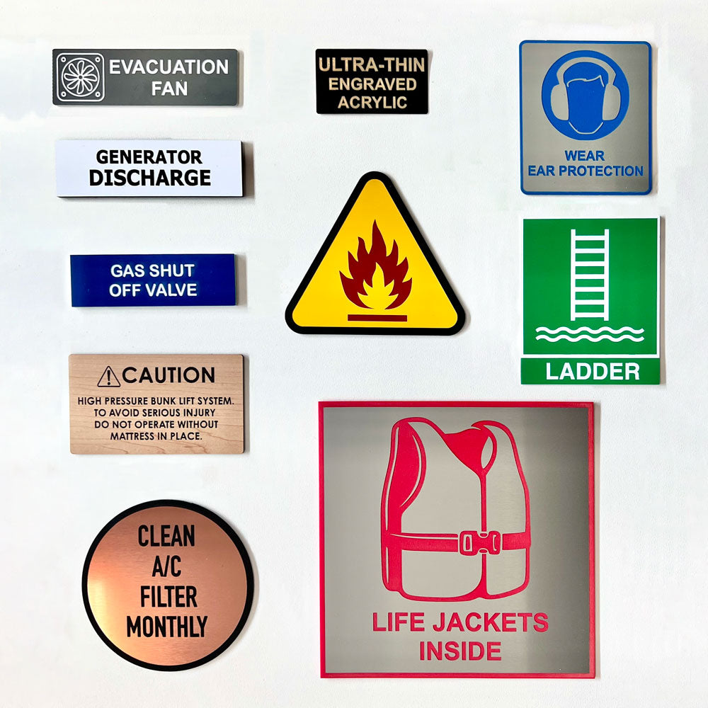 For harsh environments, engraved placards are recommended. For placards that do not need to withstand cleaning with harsh chemicals, durable full color UV printed placards are also available.